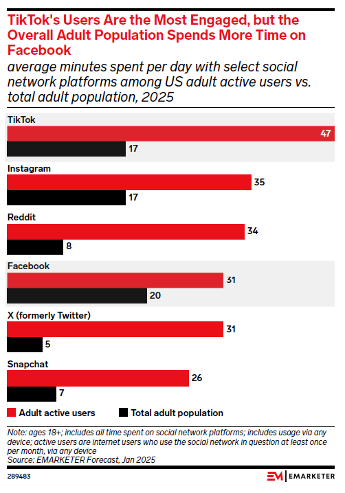 - TikTok, Facebook, and Instagram remain dominant, but time spent per user is flattening.